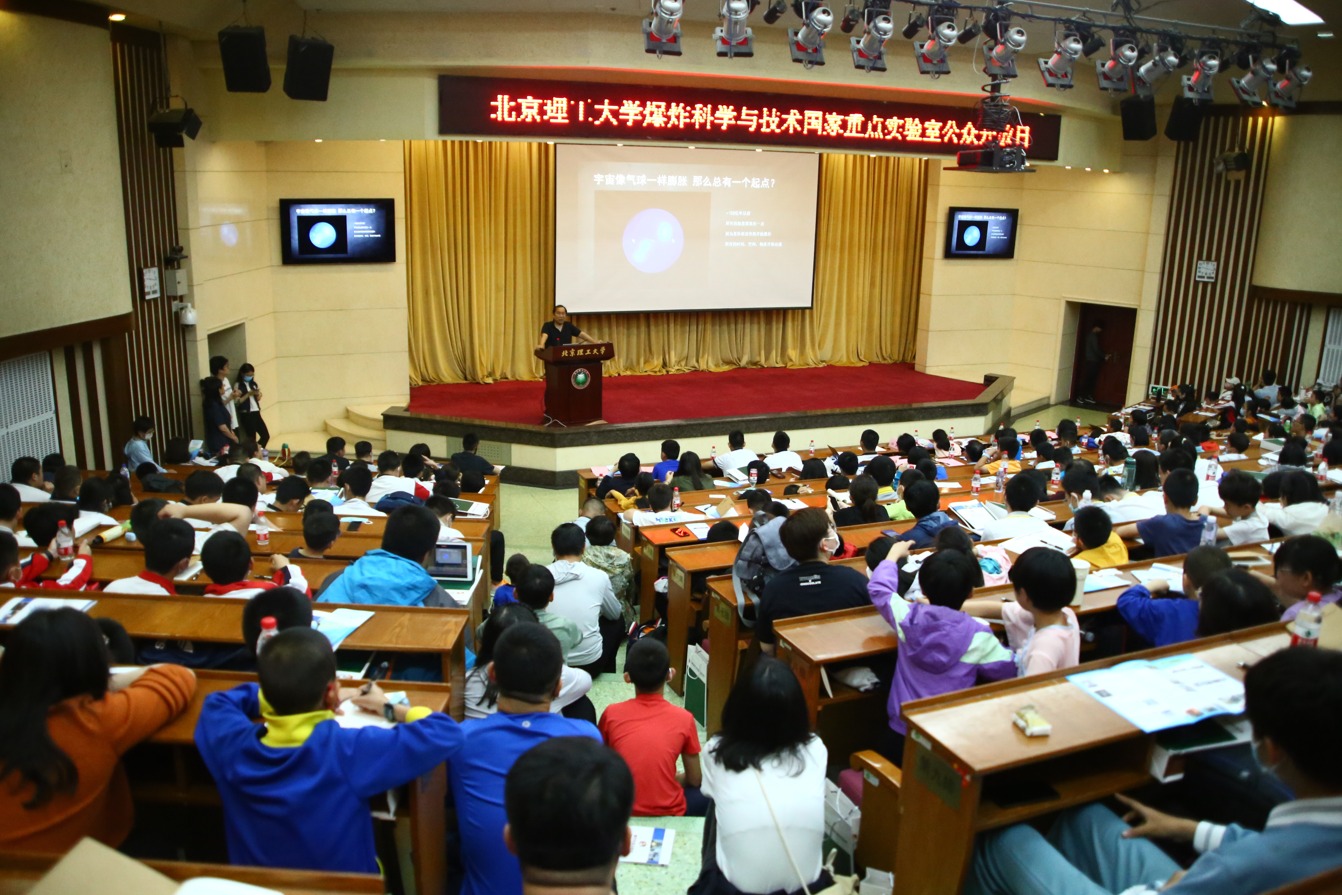 北京理工大学党委常委、副校长王博,科学技术研究院副院长邓方、科学技术协会秘书长胡晗,爆炸科学与技术国家重点实验室主任王成,机电学院党委书记王亚斌,副院长杨瑞伟、张建国、刘彦、黄广炎、韩姗杉,兵器科学与技术学科特区办副主任徐豫新,爆炸科学与技术国家重点实验室副主任杨利、王仲琦,“流浪地球”系列电影科学顾问、中国科学院物理研究所研究员梁文杰,北京理工大学余庆波教授等出席了本次活动,来自人大附中、北师大附中、北京二中、第五十五中学、史家小学等800余位师生代表以及科技爱好者参加了本次精彩的科普盛宴。大会开幕式由王成主持。