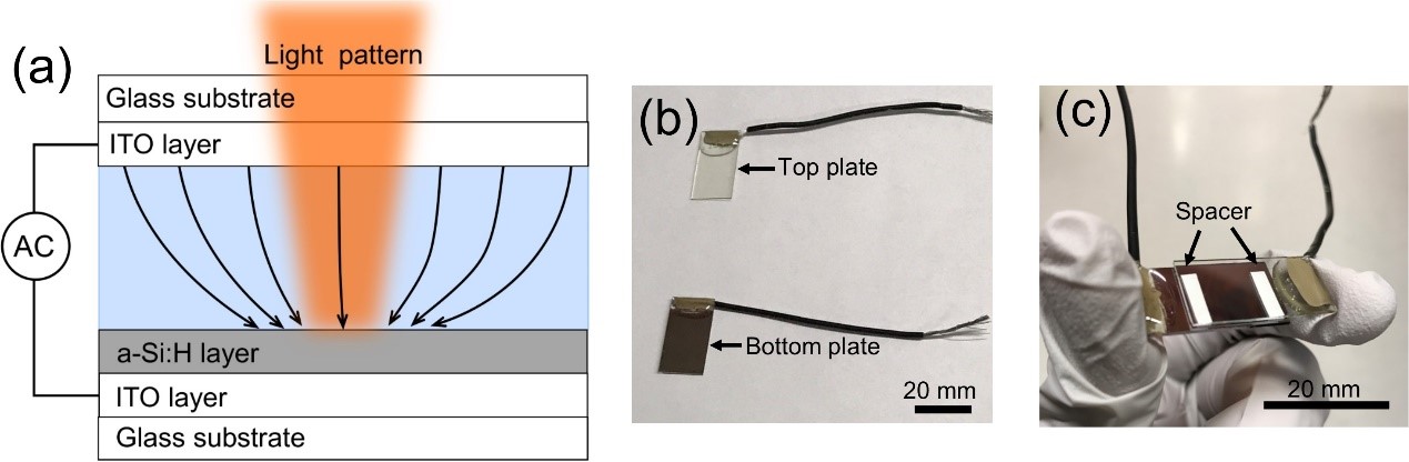 图2为光电镊的技术原理图与光电镊芯片的实物图。光电镊芯片一般由两块ITO导电玻璃基板组成,底板上镀一层光致导电层a-Si:H(氢化非晶硅)。将含有纳米/微米物体的溶液转移到光电镊芯片的腔室中后,施加交流电和光斑,光电镊器件就会在光斑的诱导下产生非均匀电场。非均匀电场与纳米/微米物体相互作用可以产生介电泳力,从而控制纳米/微米物体的空间位置。光电镊是一种利用半导体材料的光电效应将光场与电场结合在一起的微纳操控技术,它具有如可编程性好、灵活性高、多功能性强、高通量和易于与其他表征系统集成等优势,是一种非常先进的光操控技术。