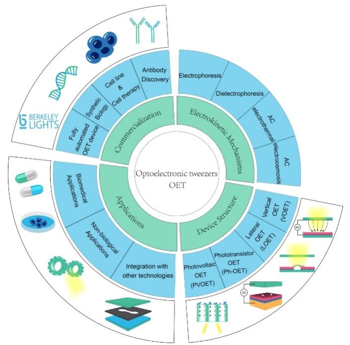 图1.光电镊技术四个方面的介绍,包括技术原理、器件结构、应用场景及技术转化