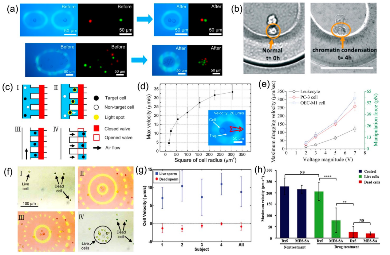 在生物领域,光电镊技术也有广泛的应用。这些应用包括但不限于对单个细胞/分子的操作、分离和分析,对细胞固有特性的分析和获取,细胞的电穿孔、融合和裂解以及生物组织材料的制备。光电镊技术可直接操纵DNA分子、蛋白质分子、细胞等。在细胞操作领域,常使用光电镊技术操控不同类型的细胞,并研究这些细胞在不同实验条件下的运动行为(如图5)。同时,其他基于光电镊的多种细胞操作技术也在快速发展,例如细胞大规模阵列化技术、细胞内药物递送、细胞转染等。随着十余年的发展,光电镊技术已成为细胞操作、细胞分析和细胞手术领域的重要技术工具。