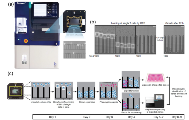 文章还介绍了光电镊技术的产业化转化以及该技术在抗体药物开发领域的应用(如图8所示)。目前基于光电镊技术的商业化平台Beacon(由BerkeleyLights公司研制)已广泛地应用于细胞株筛选、细胞疗法、合成生物学及抗体开发,且被世界多个头部制药企业采购。Beacon平台可以有效提升功能化细胞株的筛选效率,极大缩短抗体药物的研发时间,已被应用于筛选针对新冠病毒的中和抗体药物。